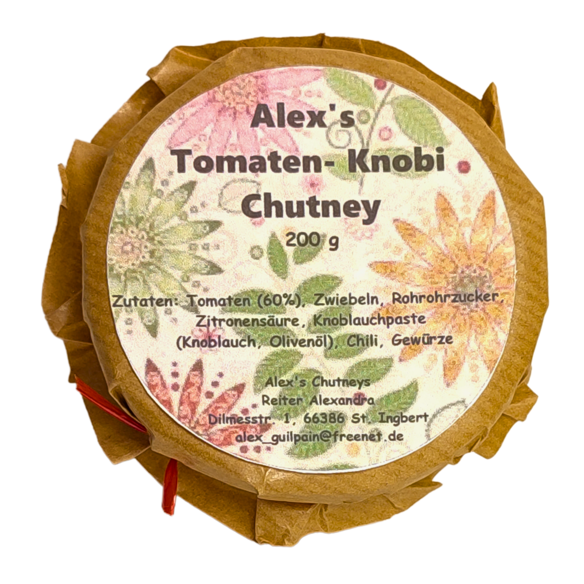 Tomaten (~60%), Zwiebel, brauner Rohrohrzucker, Apfelessig, Knoblauchpaste (Knoblauch, Olivenöl), Chili, Gewürze